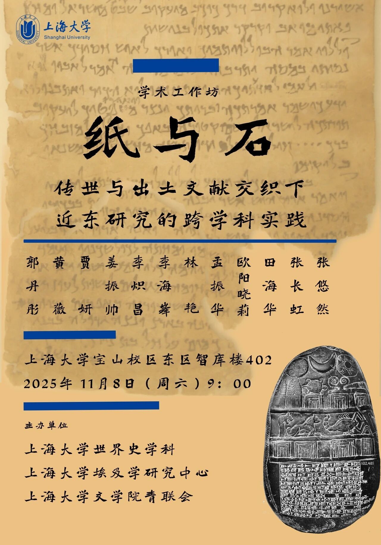 2025年11月8日,上海大学埃及学研究中心举办了“纸与石:传世与出土文献交织下的近东研究的跨学科实践”学术工作坊。来自北京大学、复旦大学、山东大学、南京大学、四川大学、华东师范大学、深圳大学、上海大学等高校、研究机构和出版机构的三十余位专家学者参与本次工作坊。
