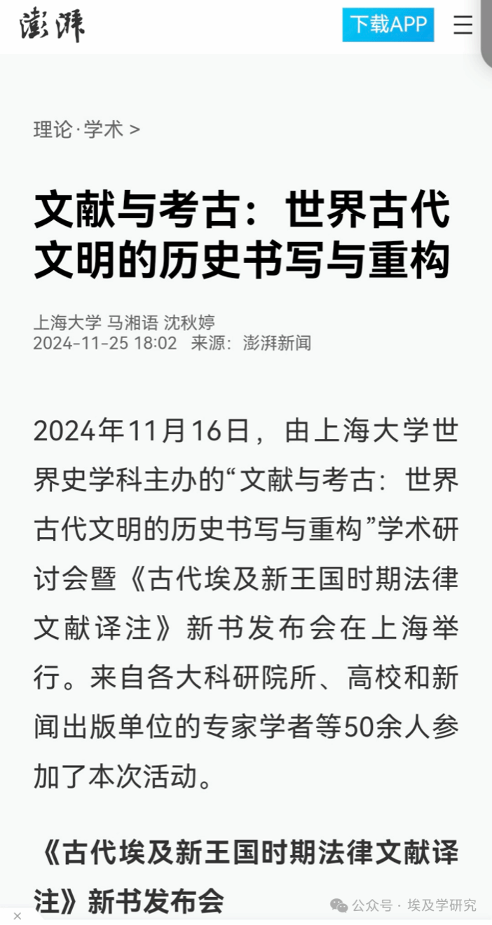 2024年11月25日,《古代埃及新王国时期法律文献译注》新书发布会被澎湃新闻报道:《文献与考古:世界古代文明的历史书写与重构》。