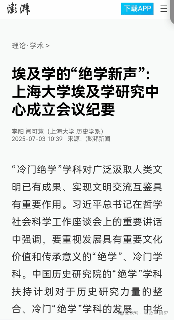 中心揭牌仪式被2025年7月3日的澎湃新闻报道:《埃及学的“绝学新声”:上海大学埃及学研究中心成立会议纪要》,并被冷门绝学研究和世界古代史研究公众号转发。