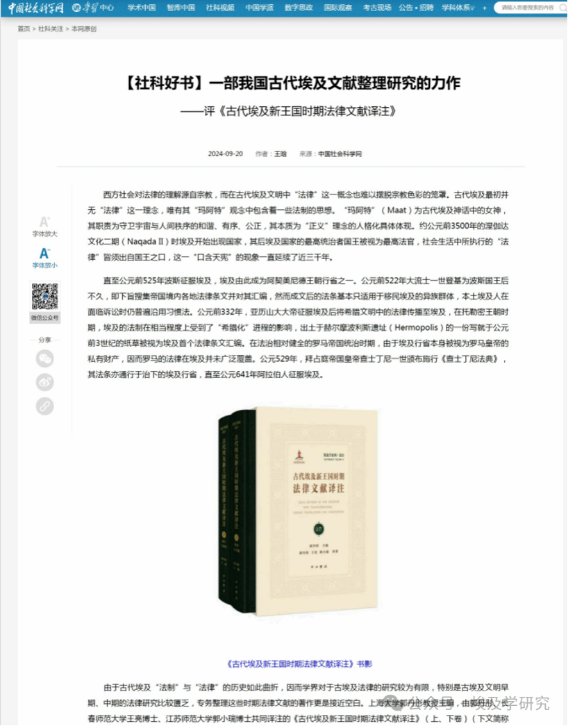 《一部我国古代埃及文献整理研究的力作——评〈古代埃及新王国时期法律文献译注〉》,《中国社会科学网》;