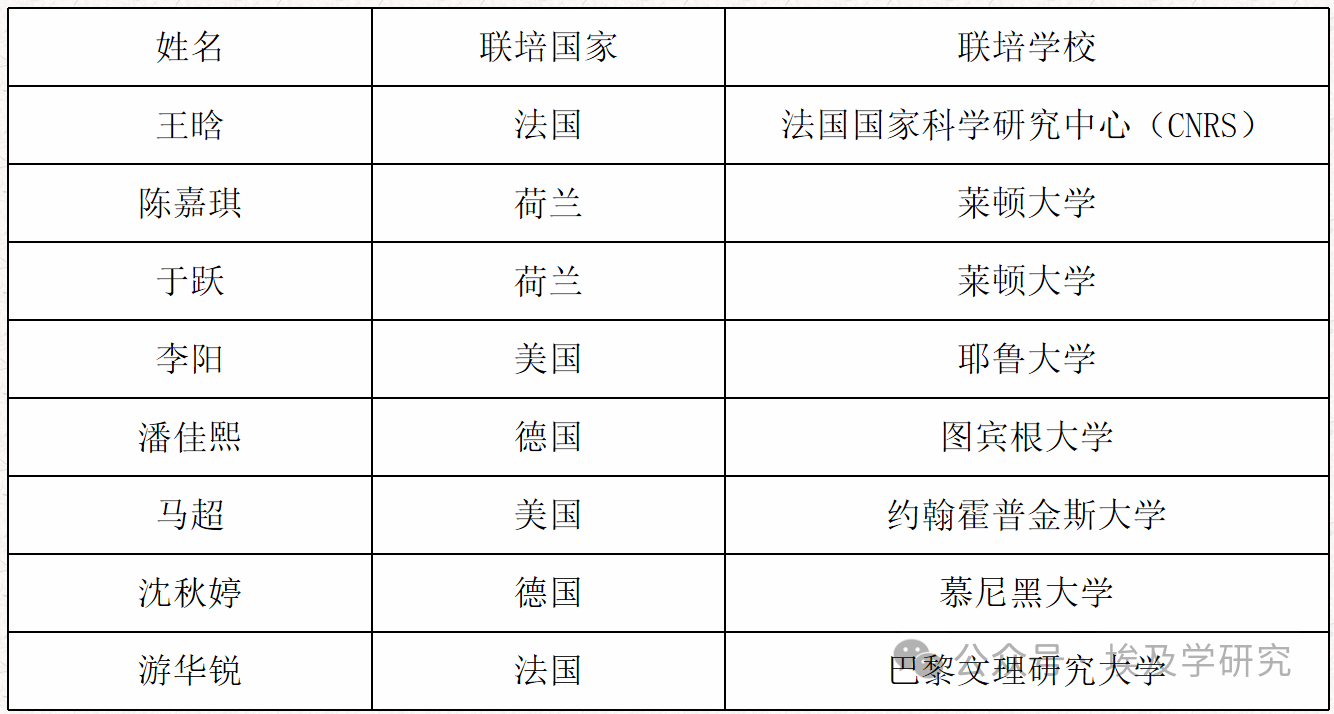 团队重视国际化人才培养,目前已有8名同学获得国家留学基金委员会的资助前往美国耶鲁大学、美国约翰霍普金斯大学、德国慕尼黑大学、图宾根大学、荷兰莱顿大学、法国国家科学学院等国际知名高校或研究机构进行联合培养博士生项目,其中游华锐同学获得资助前往巴黎文理研究大学攻读埃及学博士学位。