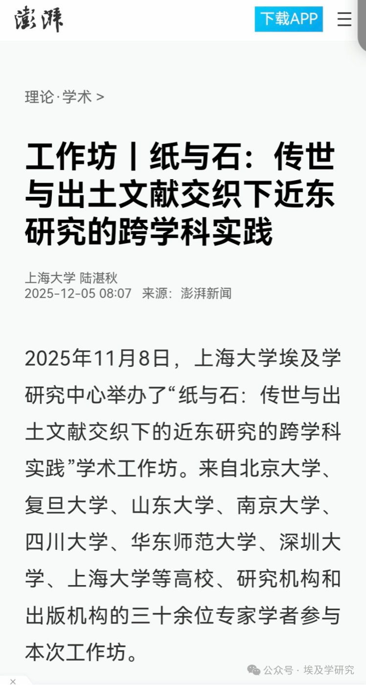 工作坊被2025年12月5日的澎湃新闻报道:《纸与石:传世与出土文献交织下近东研究的跨学科实践》。