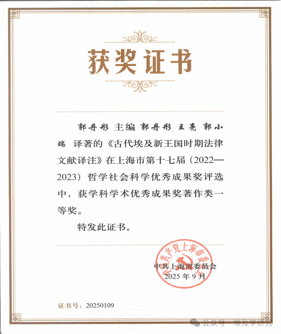 郭丹彤主编,郭丹彤、王亮、郭小瑞:《古代埃及新王国时期法律文献译注》(上、下编)获上海市第十七届社会科学优秀成果奖一等奖。