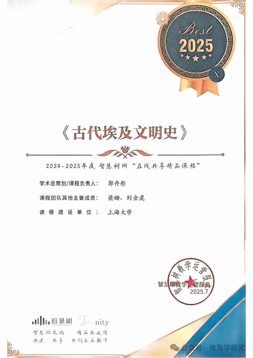 郭丹彤负责的智慧树线上课程《古代埃及文明史》在继2022年入选国家智慧教育平台精品线上课之后,再次入选2024-2025年度智慧树网“在线共享精品课程”。